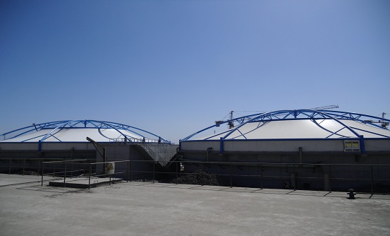 污水池反吊膜加盖可做加高设计,可将除臭设备完整的密封在钢支撑反吊膜内,与此同时,为了方便除臭设备进行检修,可以在污水池反吊膜加盖上增设门、窗。