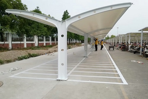 第三阶段:膜结构电动车停车棚工程的施工,安装等紧随钢结构工程的进度进行施工,严格符合钢结构尺寸、按图纸要求拉膜,覆膜。