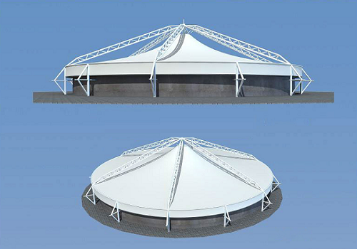 反吊形式。污水池反吊膜除臭密封罩使用膜材反吊的形式,隔绝了钢材被腐蚀风险,使用年限可达15年。