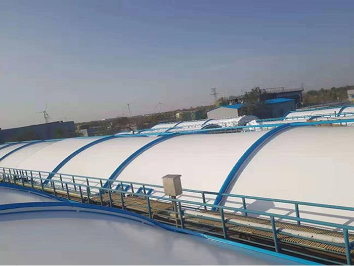 1、耐腐蚀:污水池反吊膜采用了抗腐蚀能力很强的环境工程专用膜材氟碳纤维膜把废气罩住,钢结构在外面将膜反吊。这样既发挥了氟碳纤膜的抗腐蚀性能,又解决了钢结构由于与腐蚀性气体接触而带来的腐蚀问题,因而钢结构可以按普通建筑钢结构的防腐等级考虑进行设计,具有50年的使用寿命,发挥了钢结构的性能,实现了结构骨架与覆盖材料的有机结合。