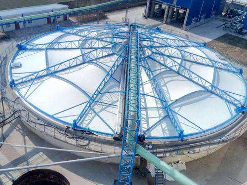 1.池体满足周边传动要求。只有污水池中的污泥处理设备以周边传动运行才可以选择随动式反吊膜,密封罩才可以跟随刮泥机的动力系统一起转动。