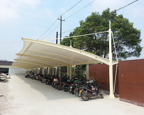 三.张拉膜结构电动车停车棚由于是先加工后安装,对场地要求低,基本上任何场所都可以施工,所以其应用范围特别广,从学校到机关单位,从社区到商场,从公园到景区都可以看到张拉膜结构电动车停车棚的身影。