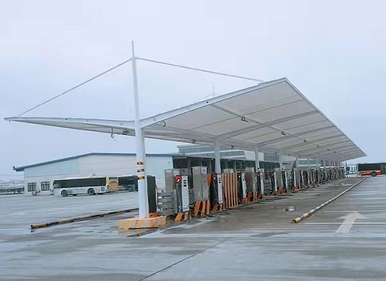 随着发展膜结构常用膜材强度越来越高,使用高强度的膜材,可以有效的抵挡大量的紫外线,有效的保护车辆,它的透光效果达20%,在膜结构顶棚的遮蔽下,充电桩仍然亮度十足,透过膜结构的阳光变得柔和,大大减少了车辆的因阳光长时间照射产生的老化。