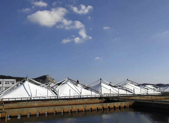 9、造型美观:污水池反吊膜密封加盖除臭具有现代建筑——膜结构的所有特点:造型飘逸美观;自洁性能好,由于膜材表面具有PVDF自洁涂层,能有效减少膜材表面的积灰的附着力,通过自然雨水即可以得到有效清洗,其抗污能力远远大于其他传统覆盖材料,能使其长久保持亮丽的观感;良好的光学性能;