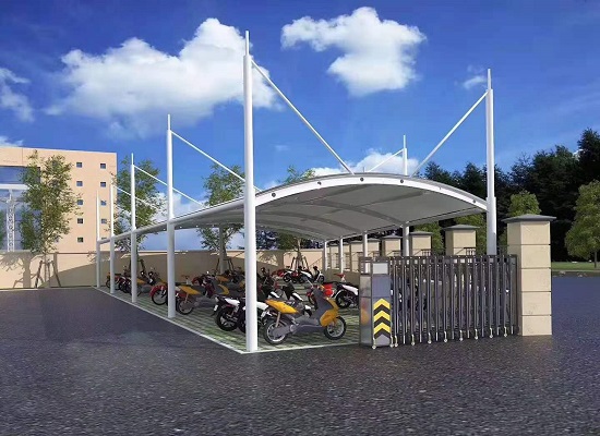 三. 张拉膜结构电动车停车棚由于是先加工后安装,对场地要求低,基本上任何场所都可以施工,所以其应用范围特别广,从学校到机关单位,从社区到商场,从公园到景区都可以看到张拉膜结构电动车停车棚的身影。
